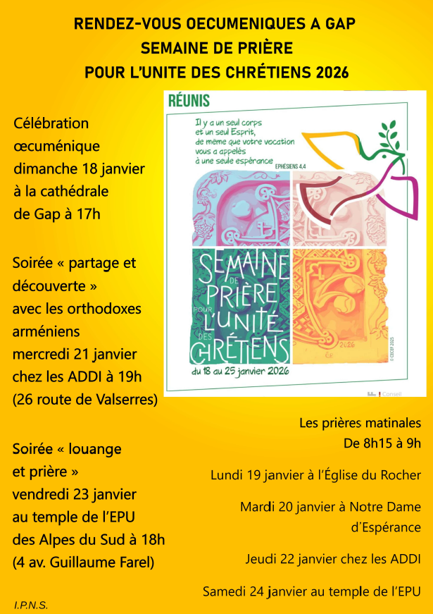 . une célébration oecuménique le mardi 20 janvier à 18h dans l’église de V eynes;