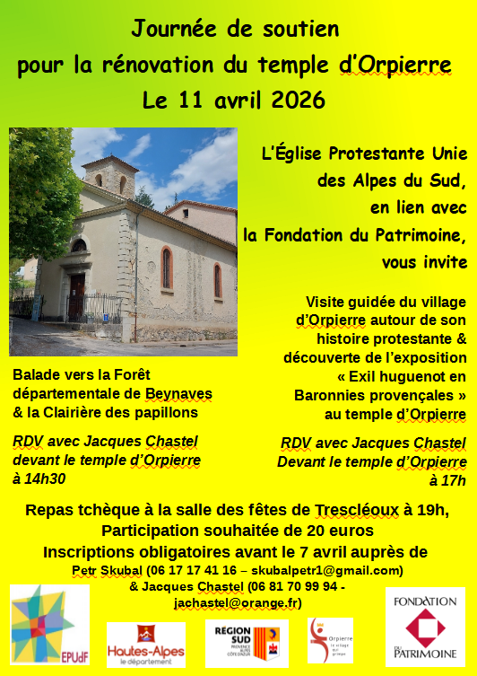 Afin d’appuyer la collecte de dons gérée par la Fondation du Patrimoine pour la restauration du temple d’Orpierre, l’Eglise Protestante Unie des Alpes du sud a le plaisir de vous convier à un après-midi culturel à Orpierre et un dîner festif à Trescléoux :